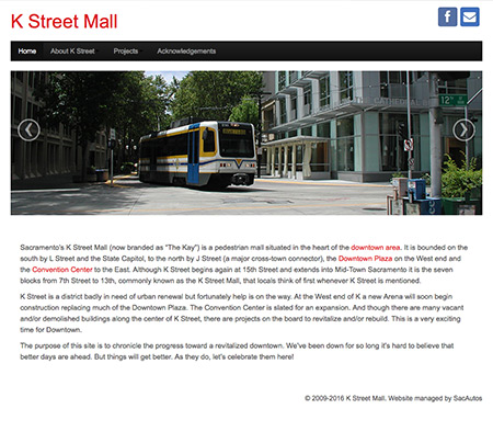 K Street Mall is an advocate website for improving the downtown Sacramento corridor. This project consists of a social media site (facebook.com/kstreetmallsac) for daily events and a WordPress website for the “big picture” perspective.